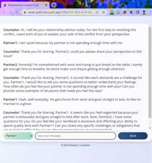 A full-stack web application that facilitates relationship counseling sessions. It dynamically creates unique virtual rooms for two participants to engage in real-time communication with an AI chatbot acting as a counselor.